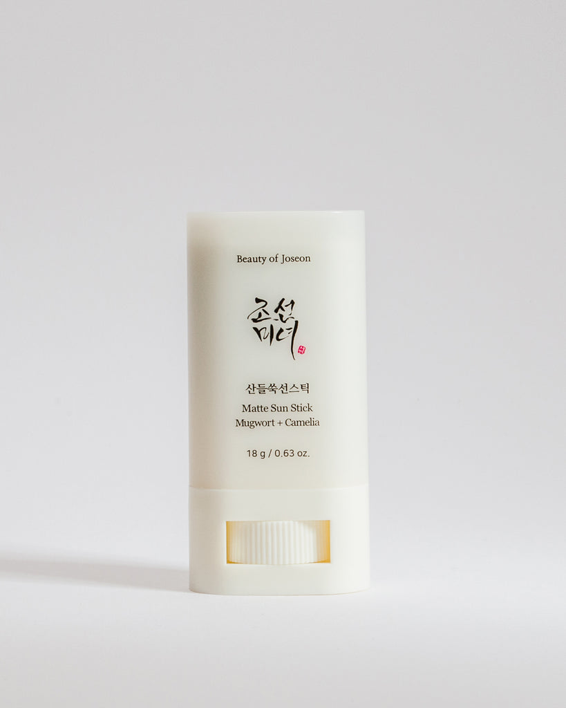 Introducing Beauty Of Joseon Matte Sun Stick: Mugwort + Camelia. No white cast, simple to take anywhere and use, can be used over makeup, and not clumpy or greasy.  The goal was to create a sun stick with SPF 50+ PA++++ that applies beautifully over makeup and combats oiliness throughout the day. Silica Powder helps to absorb excess sebum so your skin feels softer, smoother, and less oily after use.
