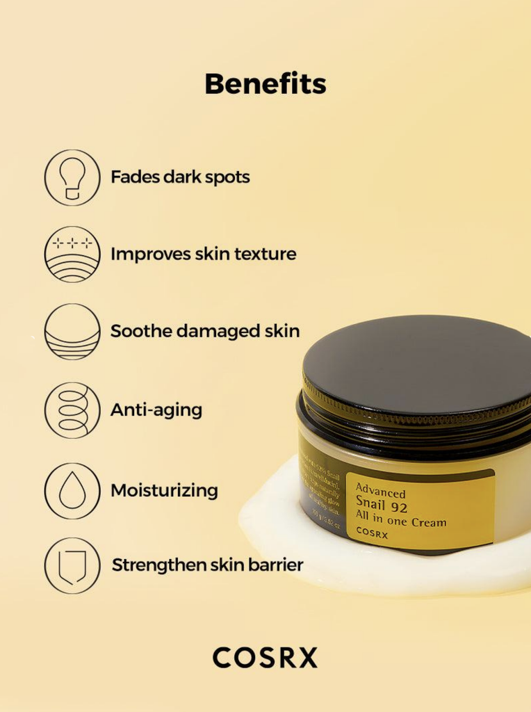 The COSRX Advanced Snail 92 All in One Cream is a moisturizer that heals, improves, and alleviates skin with moisture. This cream is infused with 92% snail secretion filtrate that fills the skin with moisture, allowing to alleviate skin damage and improve healing, but without feeling sticky. This multi-solution cream applies onto the skin and revives skin radiance. It also promotes desensitization of the skin after breakouts like rosacea. Added moisture reduces fine lines and wrinkles, enabling a natural, healthier feel to your skin. pH 5.5~1.0. Cruelty-free. Formulated without parabens, sulfates, artificial colors and fragrances, alcohol, mineral oil, and essential oils.