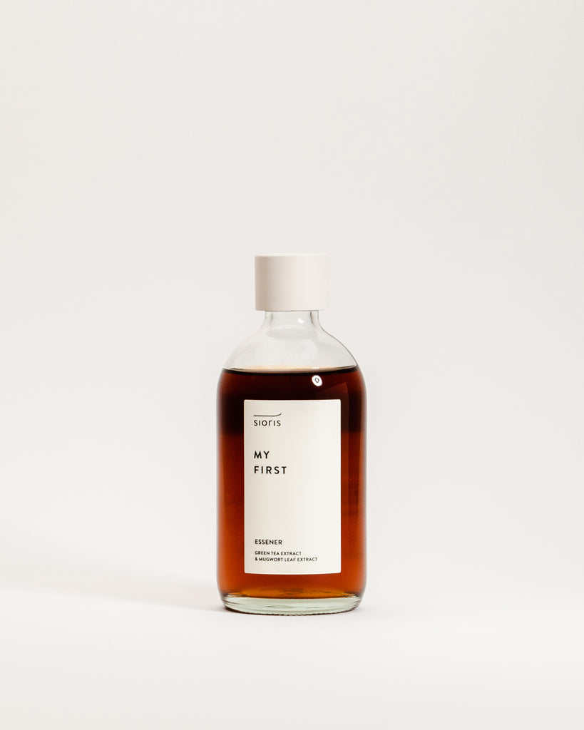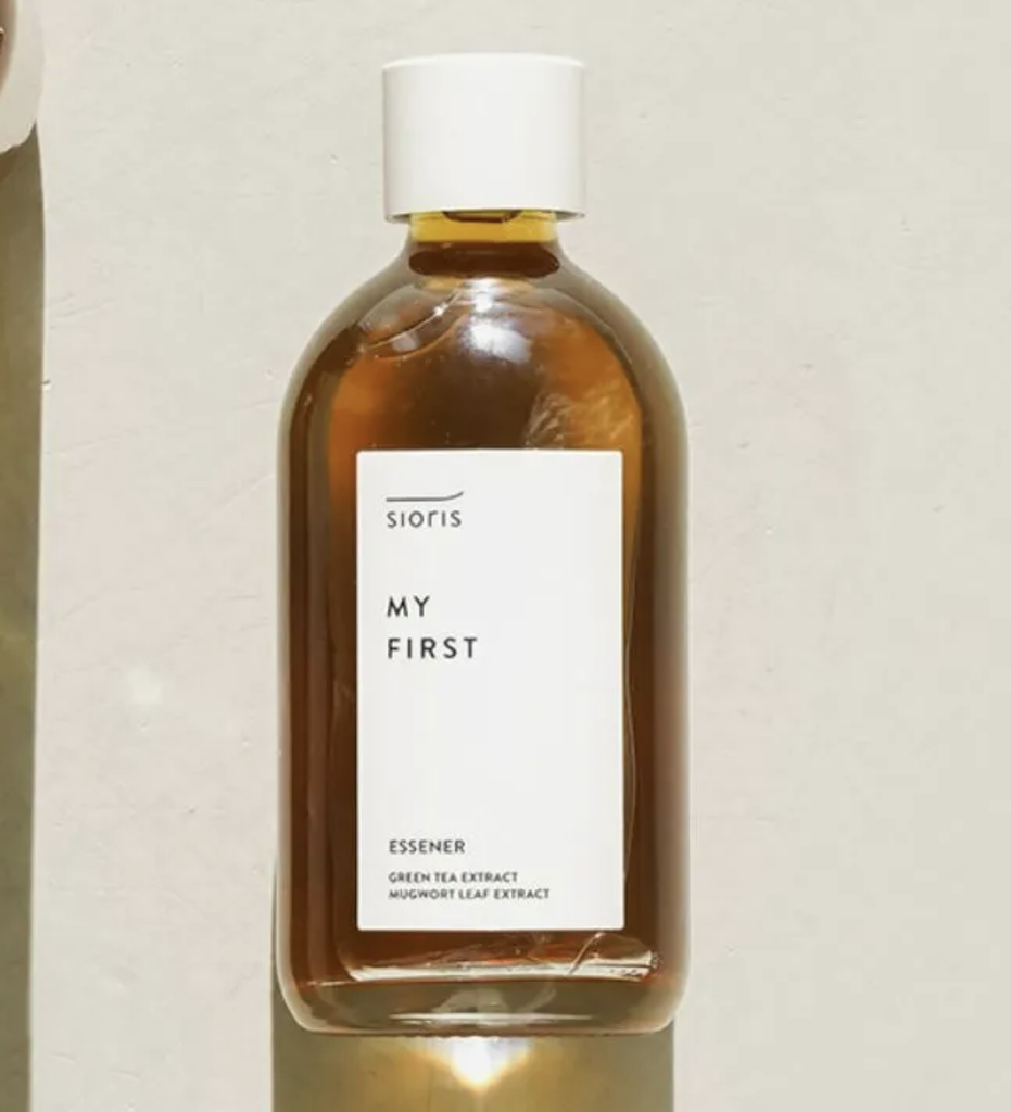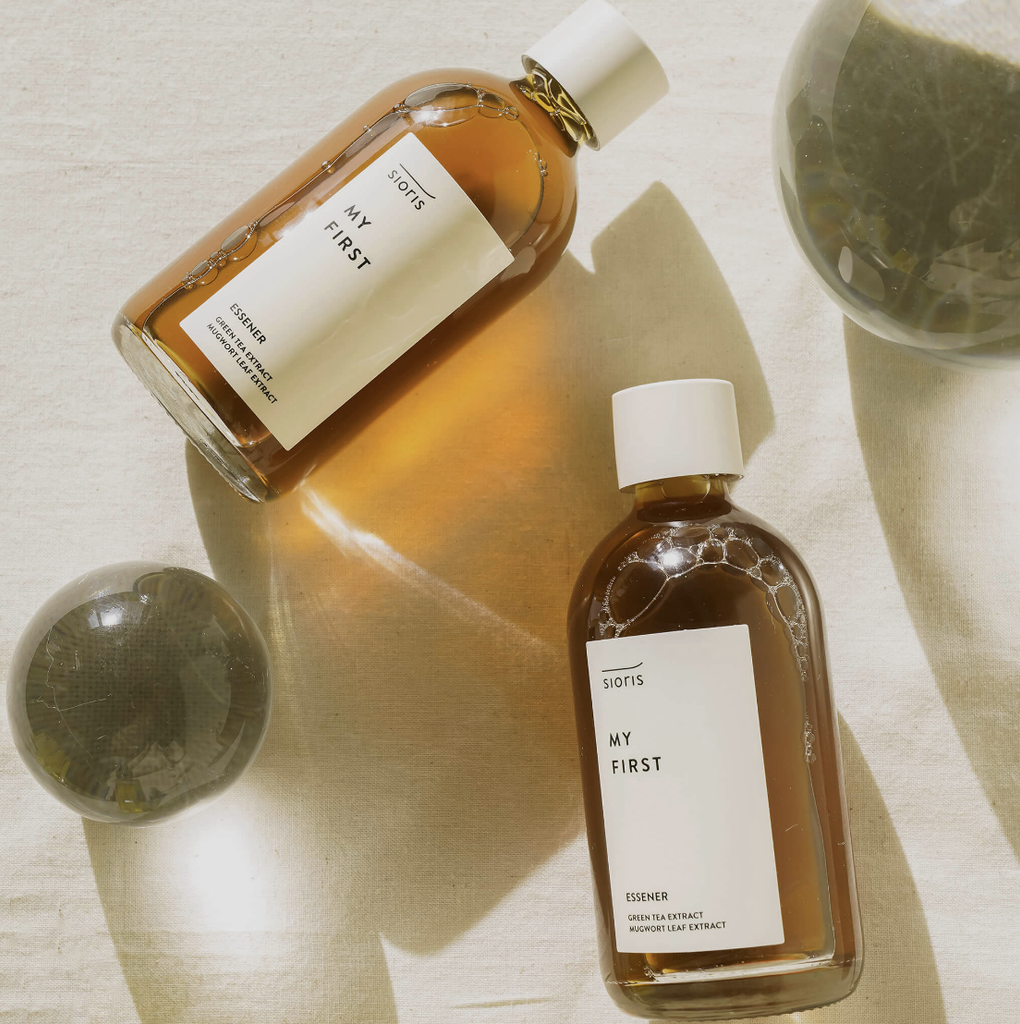 Sioris' My First Essener mixes the moisturizing properties of a toner with the hydrating properties of an essence in one "essener" mixture. Organic green tea water (47.5%), large concentration in antioxidant catechins and Vitamin B, calms agitation and defends the skin from stress, also delivering a natural, herbal scent. Polyglutamic acid, sourced from fermented soybeans, aids hydration retention through a capability to trap water moleucles 5,000x its molecular weight. Mineral abundant Artemisia princeps leaf extract also soothes the skin while increasing vitality. Triple hyaluronic acid and Betaine are included to stop moisture loss and moisturize the skin. It's faintly viscous texture glids onto the skin for instant relief and easy absorption. The glass bottle also highlights a wash-off label that dissolves in water to make it simple to reuse and recycle.