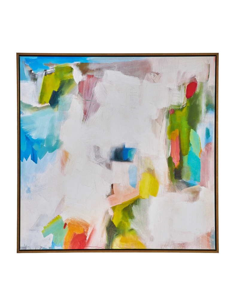 "Dream of Isles" lives up to its name with a mix of vibrant colors and a crisp white background. A gold, solid wood gallery frame complements the abundance of color. May be hung two ways. Handcrafted and printed in the USA. Artwork by Leigh Ann Van Fossan.