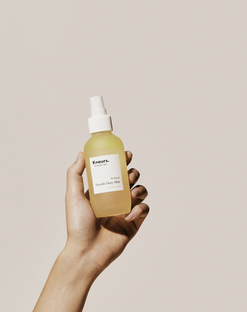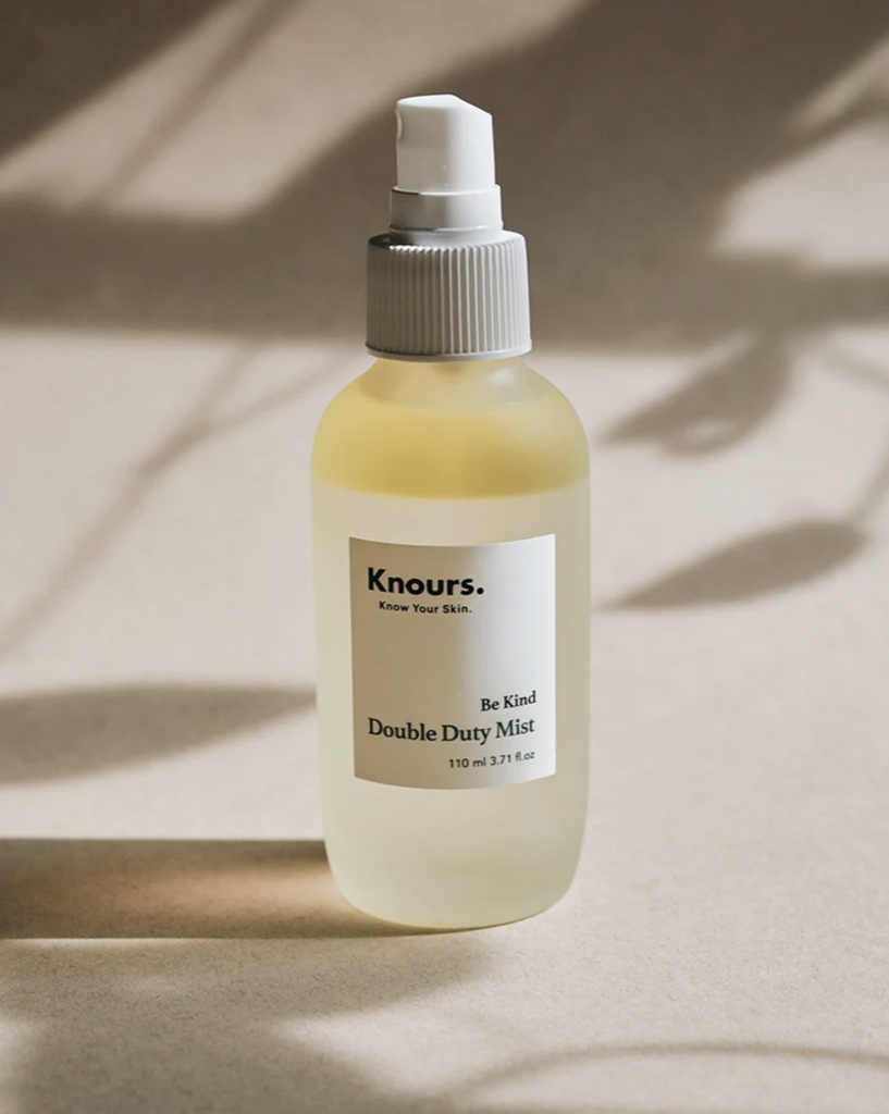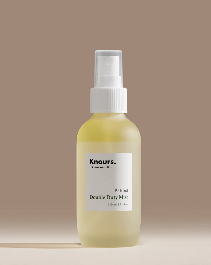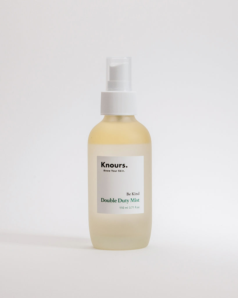 Be Kind Double Duty Mist is a dual-use, hydrating skin freshener and a frontrunner in its category. An intelligent mixture of aloe vera water and jojoba oil, layered on top of one another, enables your skin to receive what it needs to feel healthy.