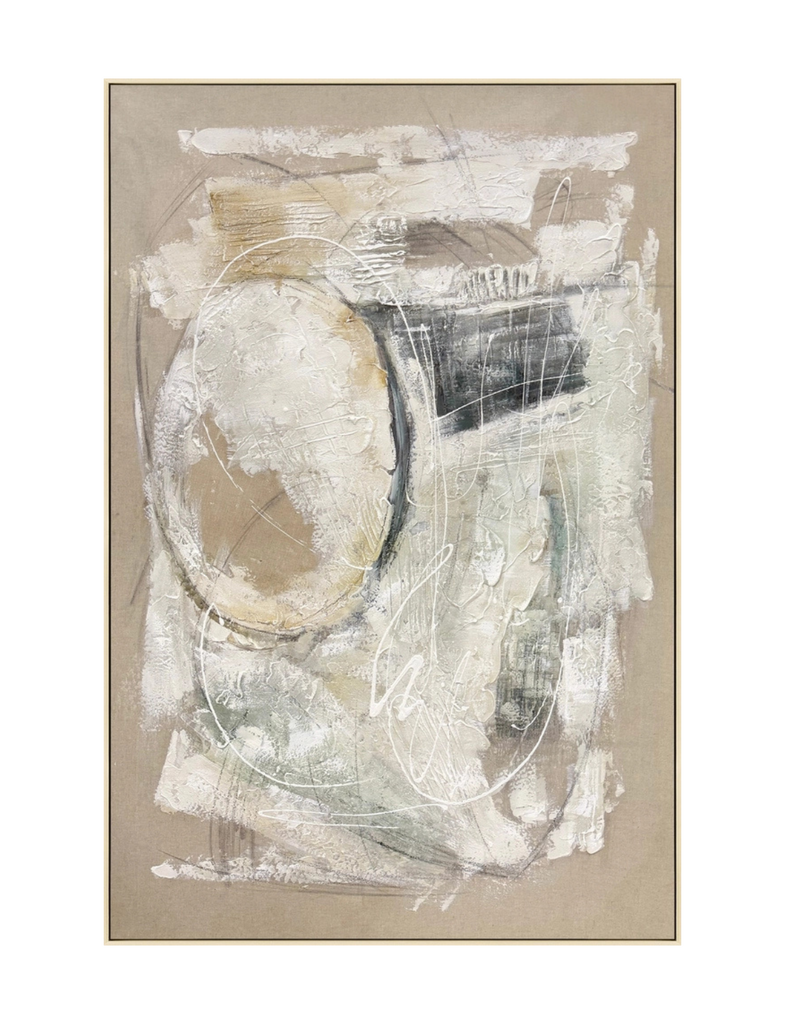 Heavily embellished canvas art with raised paint texture and 3d canvas elements in a Champagne Floating Frame.